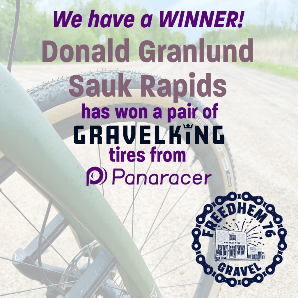 With only 30 short days left to register for the Freedhem 76 we have our winner of the early registration contest. Donald Granlund of Sauk Rapids, MN has won a new pair of GravelKing tires from Panaracer. There are many more prizes to be had. Your participation in the Freedhem 46, 76, and 106 automatically enter you into a drawing for numerous prizes from our sponsors on race day. More to come. See you in July!!